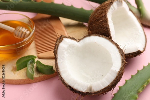 Hair treatment. Fresh coconut, honey, comb and aloe leaves on pink background, closeup