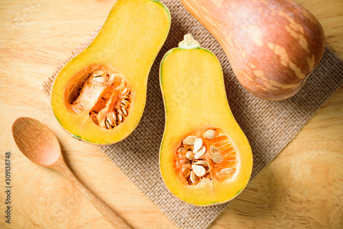 Half butternut squash on wooden cutting board preparing for cooking