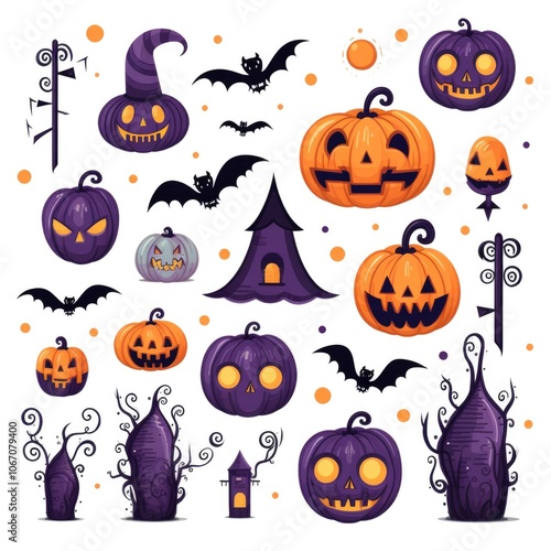 Halloween art inspired spooky pumpkins and bats with eerie witch hats