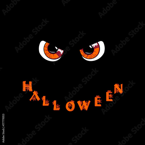 Halloween card. Orange predatory monster eyes and word halloween in shape of smile on black background. Vector illustration.
