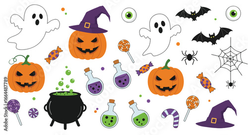 Halloween Cartoon Elements and Festive Decorations.