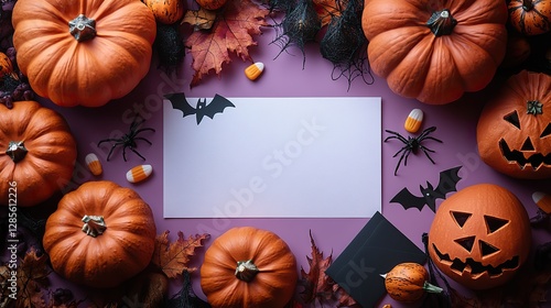 Halloween decorations top view photo of pumpkin baskets, candy corn, spiders web, cat, bats silhouettes, straws, black envelope and white card on violet background with empty space.