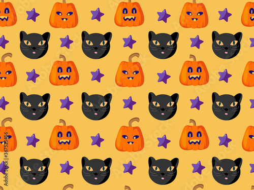 Halloween Endless seamless pattern. Bright background with cute pumpkins and a muzzle of a black cat, purple stars. For textiles, paper, themed retail textiles, packaging of traditional sweets