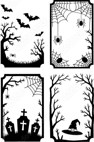 Halloween frame vector set, spooky graveyard tree spider web, creative border design, unique illustration for party invitation