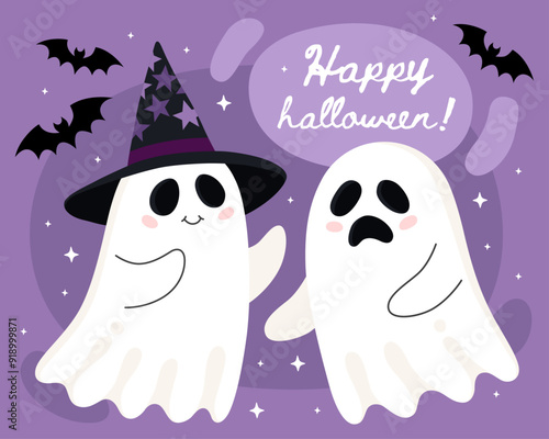 Halloween greeting card. Cute cartoon little ghosts, spirits. Cute ghost couple, smiling ghost in a black witch hat and sad ghost. Happy halloween!