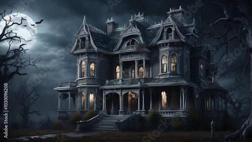 Halloween hauntingly dark and moody black building, creepy and macabre Halloween scary house poster moonlit night, holiday event Halloween banner background concept