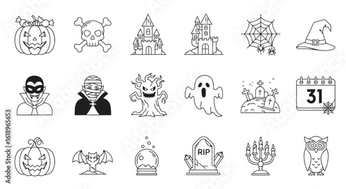Halloween icons including pumpkin vampire mummy ghost castle spider web witch hat graveyard and owl jack o lantern
