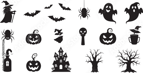 Halloween icons witch bats spiders ghosts pumpkins haunted house trees, halloween, witch, bats, spiders, ghosts, pumpkins, haunted house, trees, black, silhouette, spooky, creepy, holiday, celebration