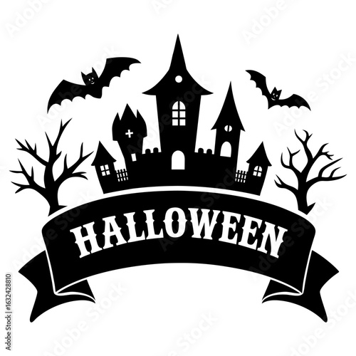 Halloween night background image with spooky castle and pumpkins. Vector elements banner, Halloween celebration greeting card, Halloween party poster. Haunted house and full moon. Halloween banner