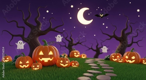 Halloween night scene pumpkins, ghosts, moon, bat, bare trees, and stone path