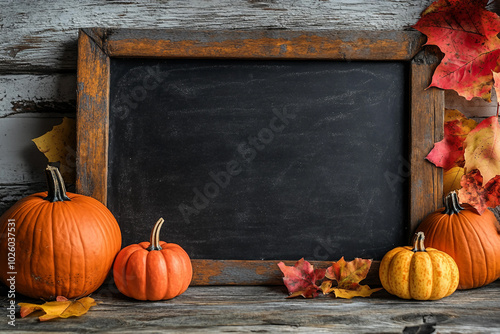 Halloween pumpkin decorations with empty black chalk board generative AI