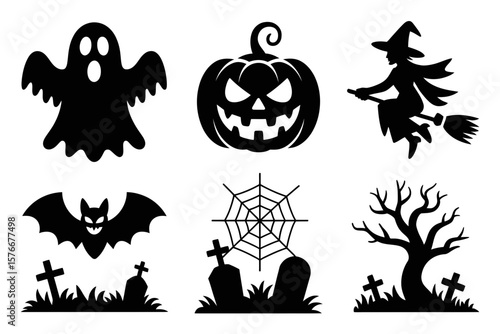 Halloween Silhouette Clipart with Ghosts, Haunted House, Bat, Witch