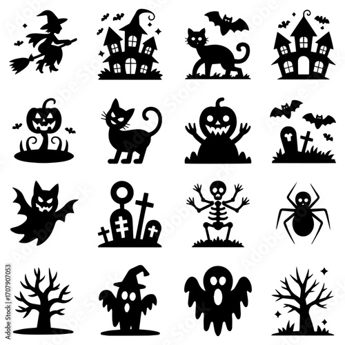 Halloween Silhouette Icon Set – Witch, Haunted House, Pumpkin, Ghost, Cat, and Spooky Vector Collection