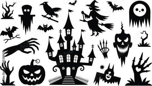 Halloween Silhouette Vector Set with Creepy Icons. Spooky Halloween Clipart Collection in Black and White.
