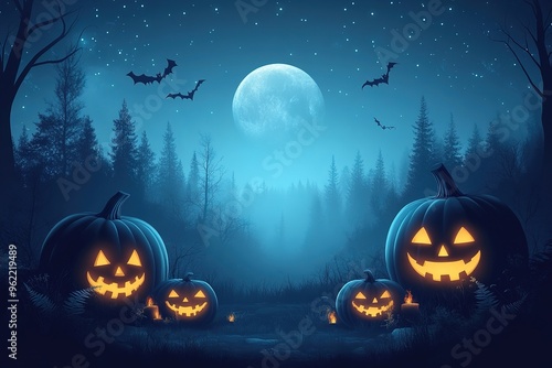 Halloween theme with pumpkins and dark forest. Scary Halloween design on table. Jack-o-lantern on the dark forest