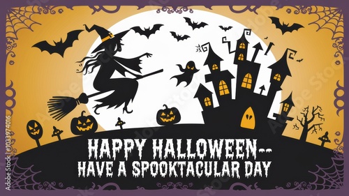 Halloween Themed Illustration: Witch on a Broomstick with Haunted Castle and Pumpkins, Perfect for Seasonal Celebrations