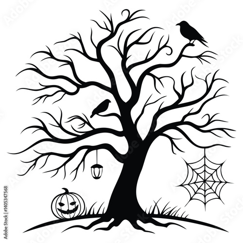 Halloween Tree with Crows, Pumpkin Vector Silhouette
