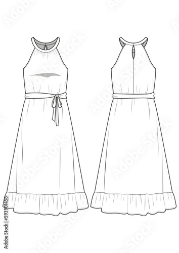 Halterneck midi dress with tie detail waistband and tiered hem technical drawing / flat sketch /CAD / ADOBE Illustrator vector digital download