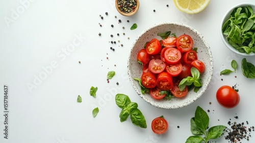 Halved cherry tomatoes in bowl with basil, peppercorns, and lemon.