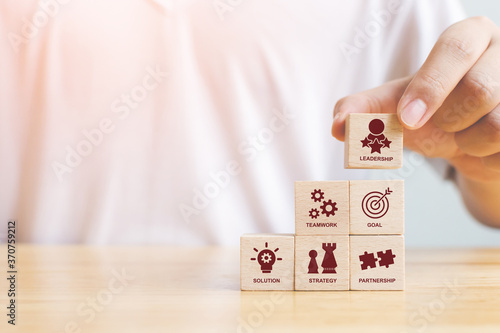 Hand arranging wood block stacking with icon leader business. Key success factors for leadership elements concept