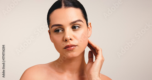 Hand, beauty and vision with woman in studio for self care, reflection and skincare glow. Perspective, shine and dermatology with person on white background for thinking, collagen and mockup space