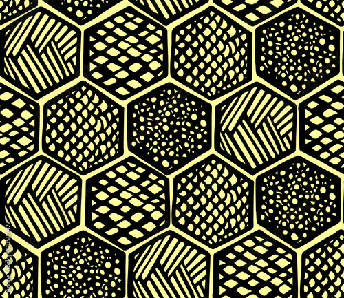 Hand drawing seamless vector pattern honeycomb on yellow background.