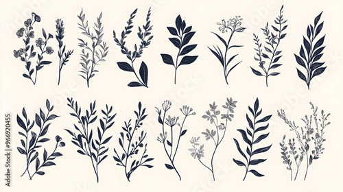 Hand drawn botanical floral elements in line art and silhouette style. Flowers, branches and leaves. Vector set for label, logo, corporate identity, wedding invitation, wreath, frame, border.