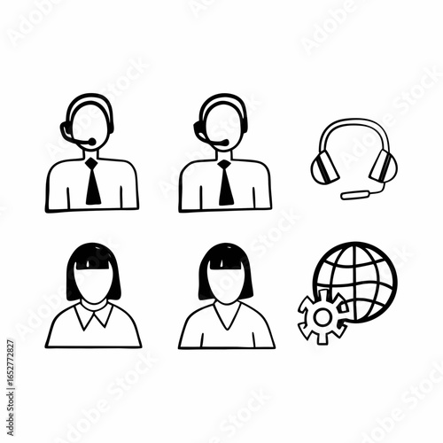 Hand drawn customer service and communication icons isolated on white background for online support and global business solutions