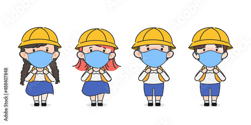 Hand drawn Cute cartoon japanese student wearing a face mask character pose.