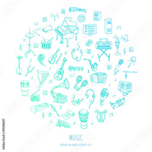 Hand drawn doodle Music set Vector illustration musical instrument and symbols icons collections Cartoon sound concept elements Music notes Piano Guitar Violin Trumpet Drum Gramophone Saxophone Harp