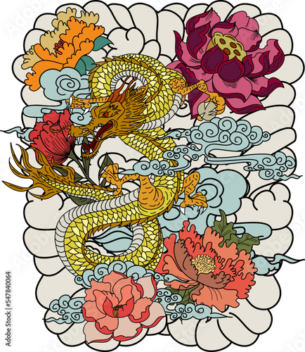 hand drawn Dragon tattoo ,coloring book japanese style.Japanese old dragon with Sunrise.Symbol of chinese dragon illustration on background for T-shirt. Traditional Asian tattoo the old dragon vector.