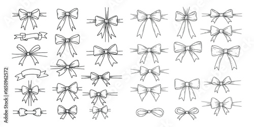 Hand drawn elegant Black line art bows and ribbons. Minimalist drawing sketch. Vintage vector illustration. Perfect for holiday poster, greeting cards, wedding invitations.
