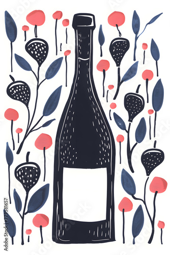 Hand drawn graphic Illustration creative poster, flyer card, banner with red wine bottle isolated on white background .
