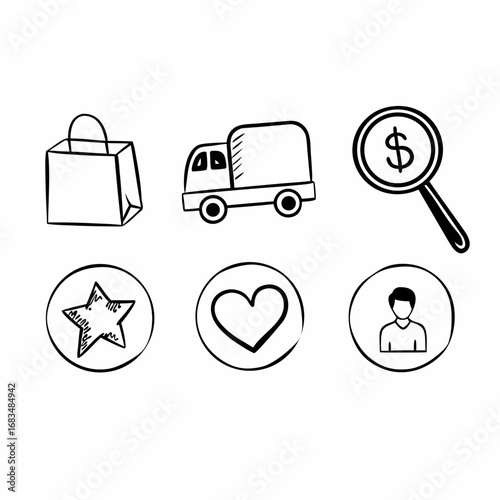 Hand drawn icons of shopping bag, delivery truck, dollar magnifier, star, heart and avatar
