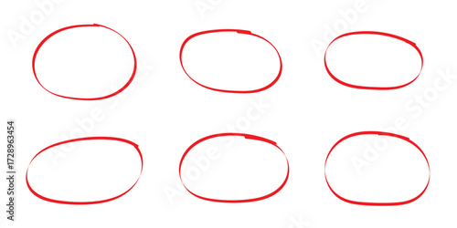 Hand drawn red crayon ovals and circles. Ellipses pencil doodle style set. Red round rough thin frames. Round freehand shapes, emphasis highlights. Vector elements for hand drawn best design Eps 10.