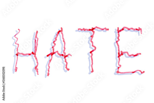 Hand drawn red marker of the word "HATE" is written on a white background. Uneven nervous inscription.