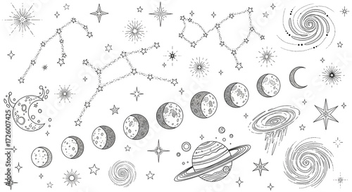 Hand drawn set of celestial elements: delicate constellations, phases of the moon, whimsical planets, stars and galaxies. Ethereal and magical line art design