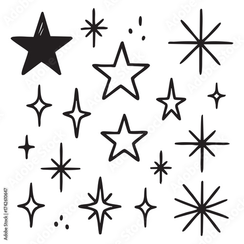Hand Drawn Starry Elements Whimsical Celestial Sparkle Illustrations for Festive Designs and Night Sky Concepts with Playful Holiday Accents
