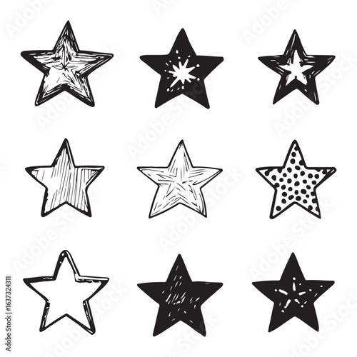 Hand drawn stars set. Doodle elements collection. Star symbols with grunge texture.