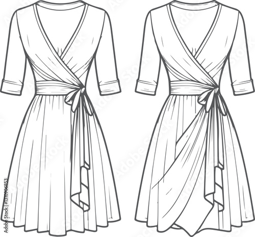 Hand drawn Wrap Dress fashion sketch Apparel template.