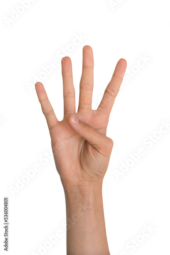 Hand forming the number four with its finger isolated on transparent background