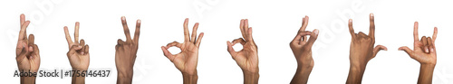 Hand gesture set with crossed fingers, peace sign, and victory pose. Black skin male making diverse