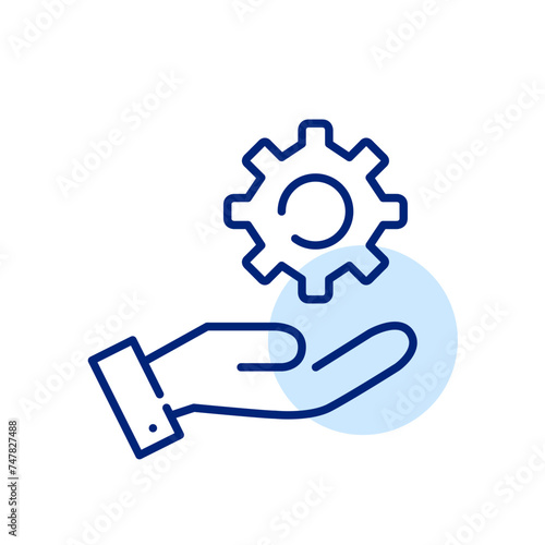 Hand holding a cogwheel. Manual control and precision. Hands-on customization and adjustment pixel perfect vector icon