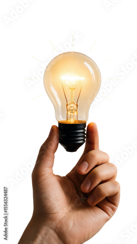 Hand Holding a Glowing Light Bulb, Symbolizing Ideas and Innovation, Isolated on Transparent and White Background