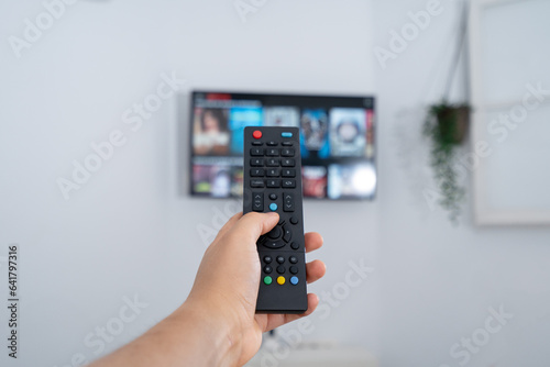 hand holding a remote control and a tv on wall playing a series