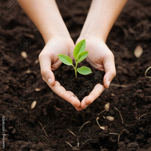 Hand holding a small green plant growing from soil
