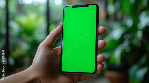 Hand holding a smartphone with a green screen.