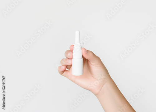 hand holding a white bottle with nasal spray