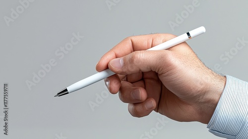 Hand Holding a White Pen Against a Neutral Background for Creative Concepts