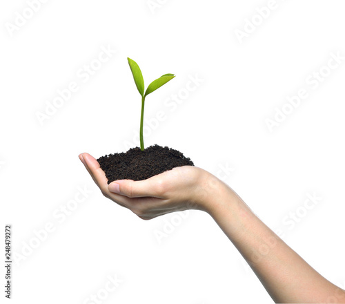 Hand holding and caring a green young plant isolated on white background